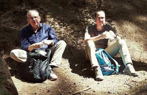 Gestärkt mit einer guten Tasse Klosterkaffee startete die Gruppe ihre Wanderung. Zuvor fand eine Kurzandacht in der Klosterkirche statt. Dabei stimmten Religionspädagoge, Stefan Schwarzmüller, und Religionslehrerin, Géraldine Wagner, die Teilnehmer/innen mit einem szenischen Anspiel auf die Thematik des Tages ein. Die ca. 12 km lange Wanderung führte rund um Esthal über Teile des Brunnenrundweges.