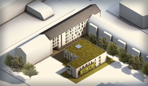 Der straßenseitige Neubau erhält eine Natursteinfassade sowie ein Satteldach. Die 40 Bewohner des Caritas-Förderzentrums sind Anfang März in die Bexbacher Straße in Ludwigshafen in das provisorisch renovierte ehemalige Altenzentrum St. Franziskus umgezogen und warten dort auf die Fertigstellung des Neubaus.