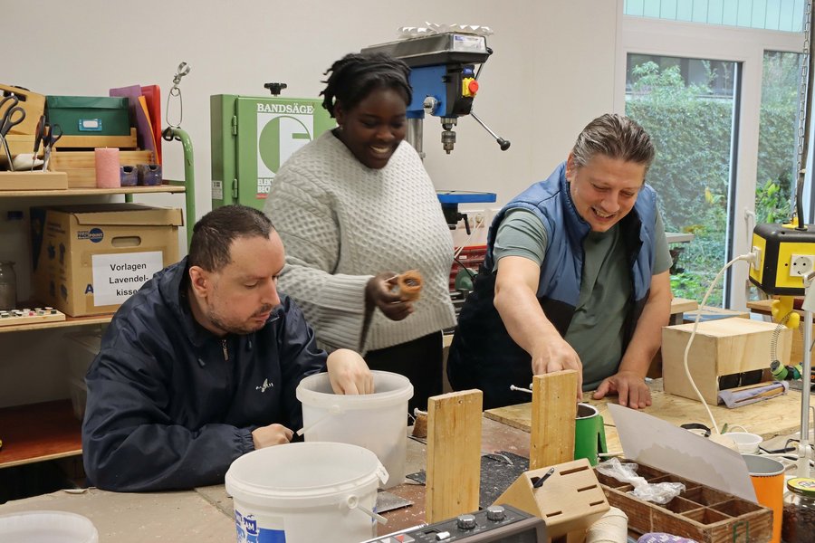 Nach dem Fachabi hat Joelisa Andre erst mal ein bisschen gejobbt und sich Gedanken gemacht, welche Ausbildung sie machen könnte. Es sollte etwas mit Menschen zu tun haben, das war ihr klar. „Ich habe schon immer gerne mit Menschen gearbeitet. In unserer Gemeinde, der Gethsemane Prayer Mission, bin in ich für die Kindergruppe zuständig. Das macht mir viel Spaß“, erzählt sie. Sie findet es spannend, andere Persönlichkeiten kennenzulernen und auch von ihnen zu lernen. Sie liebt es, Menschen zu unterstützen und ihnen eine Freude zu machen. Über ihre Mutter bekam sie Kontakt zum Caritas-Förderzentrum St. Johannes & St. Michael. Von der damaligen Leiterin des Förderzentrums bekam sie den Tipp, die Ausbildung zur Heilerziehungspflegerin zu machen. „Ich musste erst mal googeln, weil ich nicht wusste, was das ist“, gibt Joelisa Andre lachend zu. Letztlich war es aber genau das, was ihr Spaß macht, und sie liebt ihren Job. Die Ausbildung hat sie jetzt beendet und arbeitet im Moment in der Tüftlerwerkstatt der Tagesförderstätte. Die Einrichtung, zu der unter anderem auch eine Holzwerkstatt, eine Lernküche und mehrere Funktionsräume gehören, wird von Menschen mit seelischen Beeinträchtigungen besucht. Einige wohnen im Haus, andere kommen von Extern. „Wir unterstützen unsere Kundinnen und Kunden, ihren Tag zu strukturieren“, erklärt die junge Frau. In der Tüftlerwerkstatt werden zum Beispiel Elektrogeräte auseinandergebaut und sortiert. Manches kommt zum Wertstoffhof, anderes wird zu Neuem verarbeitet. Die vielen schönen Kunstwerke in der Tagesförderstätte zeugen von der Kreativität dabei. „Die Leute, die zu uns kommen, sind so offen und humorvoll. Es ist so schön zu sehen, wie sich die Leute hier entwickeln“, berichtet Joelisa Andre. „Ich finde es auch toll, zu sehen, wie die Kollegen sich für Kunden reinhängen und gefühlt Berge versetzen, um ihnen Teilhabe zu ermöglichen. Wir gehen mit ihnen auch in die Stadt, machen Ausflüge.“ Es sei schön zu sehen, dass Menschen mit seelischen Beeinträchtigungen hier nicht auf ihre Erkrankung reduziert würden.