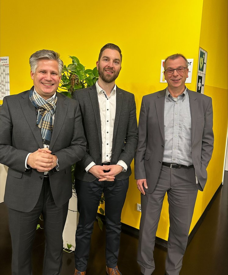 Neue Führungsspitze: Nicolai Hellie (Mitte) wird von den Diözesanleitern Prof. Dr. Christopher Wolf (links) und Matthias Geist (rechts) in ihrer Mitte willkommen geheißen. © Malteser Speyer