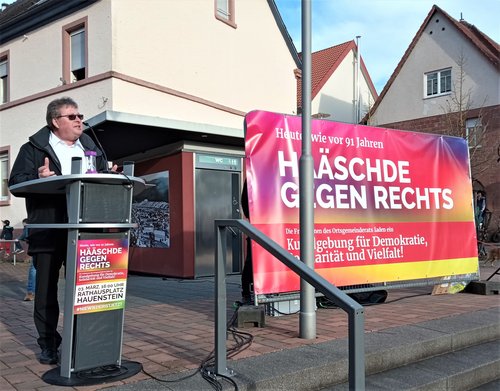 Hauenstein. Am Sonntag, 3. März, läuteten in Hauenstein um 15:50 Uhr die Glocken der Bartholomäuskirche. Auf dem in Sichtweite gelegenen Rathausplatz wurde gerätselt, ob es um diese Zeit eine religiöse Veranlassung geben könnte oder ob es mit der in zehn Minuten beginnenden Kundgebung zu tun hat. Es hatte, wie Pfarrer Robert Burger in seinem späteren Vortrag aufklärte. Die Kundgebung war angekündigt mit dem Motto „Heute wie vor 91 Jahren - Hääschde gegen rechts“ und auch schon vor genau 91 Jahren hatten in Hauenstein die Kirchenglocken aus außerordentlichem Anlass geläutet.