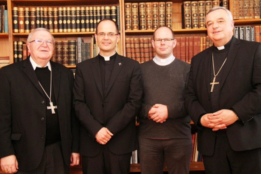 Bischof Dr. Karl-Heinz Wiesemann und Weihbischof Otto Georgens begrüßten den neuen Rektor des Wallfahrtsortes Marienthal Père Franck Guichard (2. von links) und den dort ebenfalls tätigen Seelsorger Père Karol Webierski-Teben.