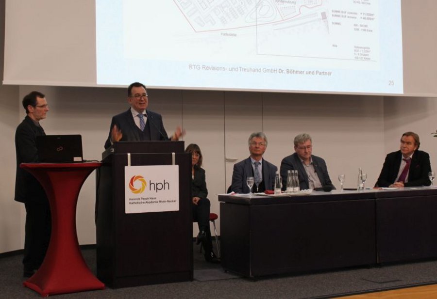 Pater Johann Spermann SJ, Direktor des HPH (am Pult), informierte gemeinsam mit anderen Vertretern des Hauses und des Dekanates über die Pläne für die Heinrich Pesch Siedlung.