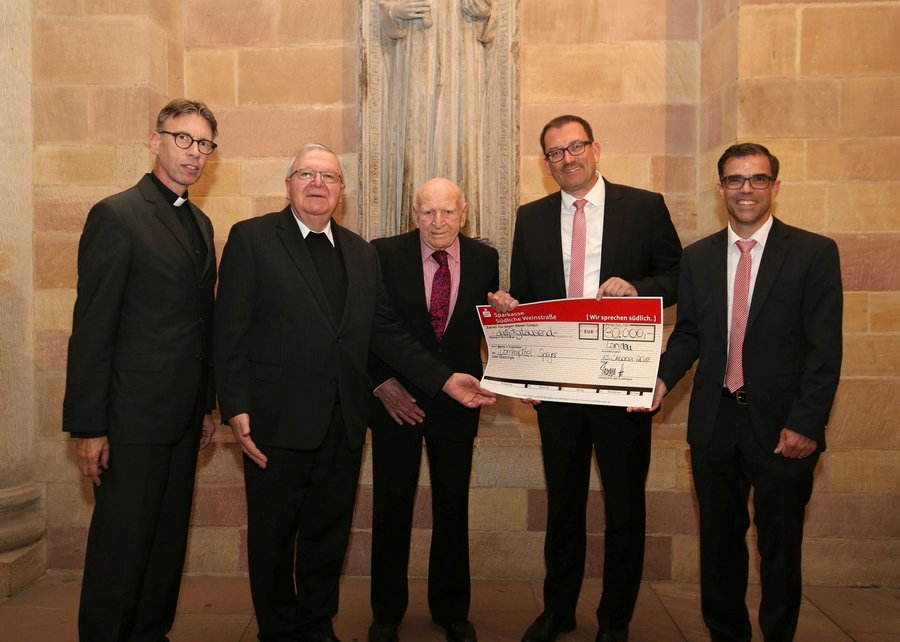 Dompropst und Weihbischof Otto Georgens nahm den Stiftungsertrag aus den Händen der beiden Vorstände der Stiftergemeinschaft Sparkasse Südliche Weinstraße, Frank Jäckle und Thomas Nitz, entgegen. Der Dompropst dankte dem persönlich anwesenden Stifter Dr. Albrecht Würz dafür, dass er den Dom so großzügig bedacht hatte: „Es kommt nicht oft vor, dass das Domkapitel so viel Geld überreicht bekommt, entsprechend dankbar sind wir für dieses Geschenk.“ Würz erklärte, dass er sich schon früh Gedanken gemacht habe, was mit seinem Geld passieren solle, wenn er einmal nicht mehr sei. Denn dass einem mit dem Tod nichts mehr gehöre, das habe der heute 95-jährige bei der Predigt eines Kaplans in der Neustadter Marienkirche vor 23 Jahren verstanden. Da er mit amerikanischen Geschäftsfreunden immer wieder den Dom besucht habe und sich sehr für die Geschichte seiner Heimat interessiere, sei eine Stiftung für den Dom für ihn die logische Entscheidung gewesen.