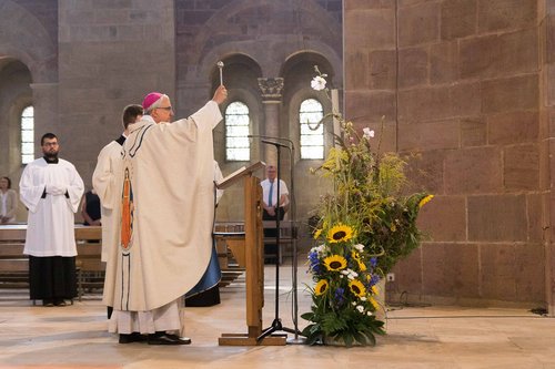 Karl-Heinz Wiesemann gedachte seinem verstorbenen Vorgänger Bischof Anton Schlembach. Er dankte Weihbischof Otto Georgens und dem Domkapitel für die Jahre des gemeinsamen Wegs in der Diözese sowie allen Mitarbeiterinnen und Mitarbeitern. Er danke seinen Mitbrüdern im Presbyterium und allen, die sich für das Verkünden von Gottes Wort einsetzen. Der Bischof richtete seinen Dank auch an diejenigen, die sich in der Kirche engagieren sowie an die Gläubigen, von denen viele „meinen und unseren Dienst hier mit Gebeten begleiten - das ist ein großer, großer Trost“. Sein Dank galt auch denen, die zur Kirche stehen und ebenso denen, die darunter leiden, dass die Kirche nicht immer überzeuge und glaubwürdig wirke. Es gelte, so der Bischof, immer wieder um die Erneuerung durch den Geist Gottes zu beten und sich immer wieder neu von der Freude des Evangeliums inspirieren zu lassen.