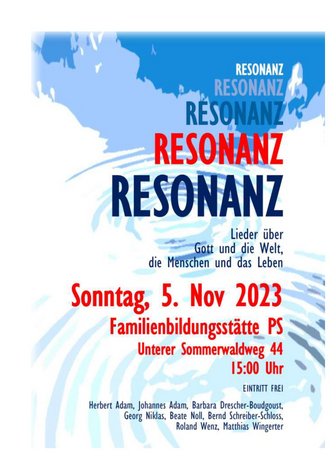 Zu Gast ist die Gruppe Resonanz. Die acht Musiker*innen, rund um Herbert Adam, machen schon seit 25 Jahren in wenig veränderter Besetzung gemeinsam Musik. Mit Gitarren, Posaune, Klarinette, Saxophon, Geige, Perkussion, Keyboard und Gesang begeistern sie ihr Publikum mit Liedern über Gott und die Welt, die Menschen und das Leben. Für ihre Programme vertonen sie neben eigenen Texten, lyrische Werke von Morgenstern, Ringelnatz, Heinz Erhardt und Hans-Dieter Hüsch. Poetisch, satirisch und spirituell geben sie Antworten auf menschliche Grundfragen, blicken aber auch auf die kleinen Widerfahrnisse menschlichen Lebens. Dazu gibt es Zwischentexte und Lieder zum Mitsingen für das Publikum.