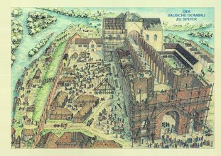 Der Autor Jörg Finkbeiner zeigte in seiner Präsentation einzelne Seiten der Publikation und erläuterte seine Aussagen an Hand bildlichen Darstellungen. Er begann mit der Gründungsgeschichte des salischen Doms und nahm auf Vorgängerbauten und weitere Gründungen von Salierkaiser Konrad II. Bezug. Dabei machte er deutlich, dass der Speyerer Dom, auch unter den anderen romanischen Domen wie Worms und Mainz, eine absolute Sonderstellung innehat. Als kaiserliche Basilika wurden hier etliche Pionierleistungen der Baugeschichte vollbracht, darunter das riesige Stufenportal, die durchgehende Überwölbung und die Gestaltung als Wegkirche mit dem Hauptaltar im Osten. Der gewaltige Steinbau stand dabei ohnehin in krassem Gegensatz zu den Flechthäusern, die sich in der Umgebung des Doms befanden, so Finkbeiner.