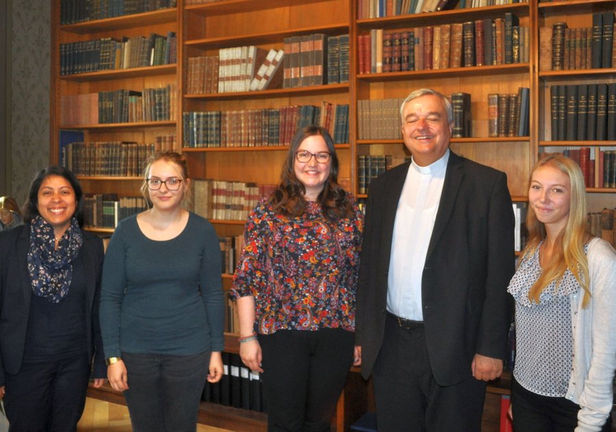 So auch am 27.08.2018, als Herr Bischof Dr. Wiesemann sich Zeit nahm um seine jüngsten Mitarbeiterinnen kennenzulernen. „Denken Sie immer daran, es gibt keine dummen Fragen“ ermutigt er während des persönlichen Gesprächs. „Wir sind alle Teil einer großen Gemeinschaft und in einer Gemeinschaft darf und soll man auch Fragen stellen, denn nur so kann man auch voneinander lernen und gerade als (Dienst-)Gemeinschaft zusammenwachsen.“