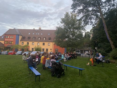 Anlässlich des Jubiläums fand am Donnerstag, den 15. September auf der Wiese des C-Hauses ein Abendgebet statt. Unter bunt beleuchteten Bäumen stand die Statue des Heiligen Christophorus, welcher seit Beginn an Namenspatron des Hauses ist und Schutz für die Reisenden bieten soll, im Mittelpunkt. Im Rahmen des Abendgebetes waren die Anwesenden eingeladen, zu berichten, was das C-Haus für sie bedeutet und wofür sie dankbar sind. Durch die musikalische Untermalung und das gemeinsame Singen wurde das Gefühl von Gemeinschaft und Verbundenheit deutlich spürbar und trug zu einer heimischen Atmosphäre bei. An das Abendgebet schloss ein gemeinsames Essen an. Das Team des C-Hauses zauberte ein großes vegetarisches Grillbuffet und in geselliger Runde fand der Abend einen gemütlichen Ausklang.