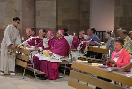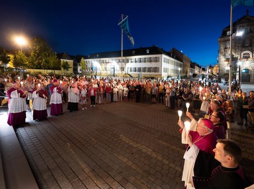 An die Marienfeier im Dom, die Dompfarrer Matthias Bender leitete, schloss sich die stimmungsvolle Lichterprozession durch den Domgarten an. Die musikalische Gestaltung hatten die Frauenschola Musica InSpira unter der Leitung von. Monika Keggenhoff und die Dombläser übernommen. Den Schlusssegen nach der Prozession vor dem Dom spendete Bischof Dr. Karl-Heinz Wiesemann.