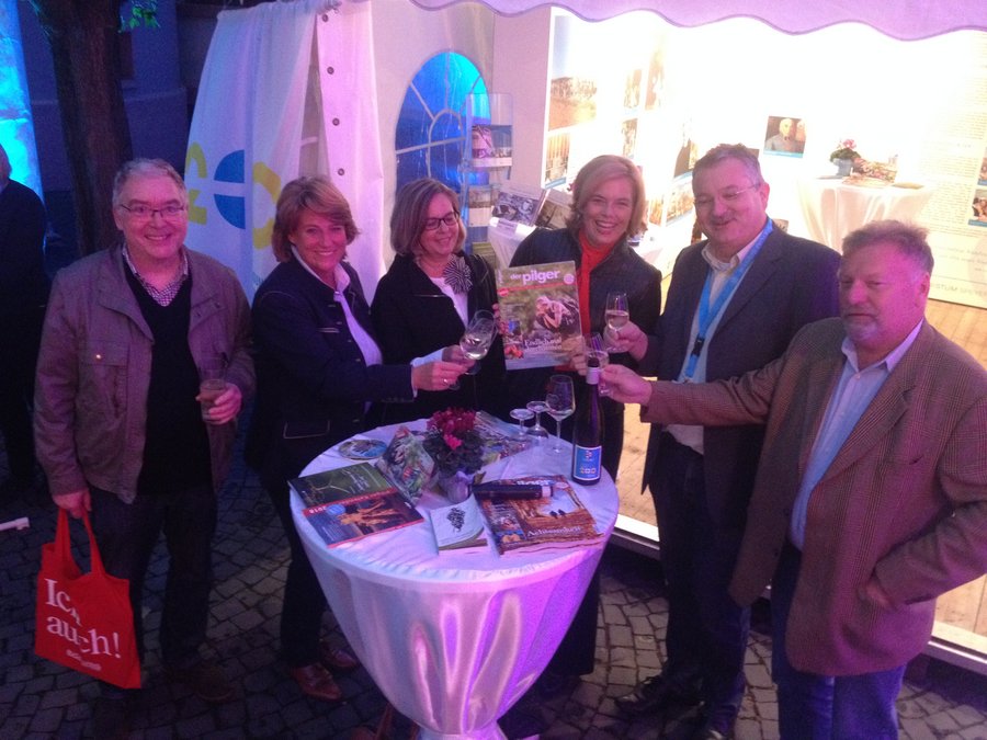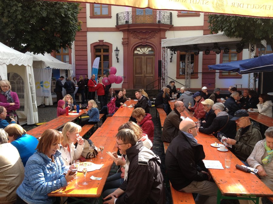 Mainz. In der Landeshauptstadt Mainz fand das zentrale Fest zum Tag der Deutschen Einheit statt. In der gesamten Innenstadt präsentierten die verschiedenen Bundesländer, zahlreiche Institutionen und Organisationen ein vielfältiges Programm, mit vielen Mitmachangeboten für Groß und Klein. Mit dabei im Hof des Bischöflichen Ordinariats am Bischofsplatz in Mainz waren auch das Bistum Speyer und die Kirchenzeitung "Der Pilger". Die Besucher konnten sich mit einer Ausstellung über "200 Jahre Neugründung des Bistums Speyer" informieren und bei einem Glas Wein über das kirchliche Leben in der Pfalz und im Saarpfalzkreis ins Gespräch kommen. Die Bistumszeitung "Der Pilger" stellte ihr neues Magazin vor. Zahlreiche Besucher fanden den Weg in den Hof des Bischöflichen Ordinariats, darunter der neue Mainzer Bischof Peter Kohlgraf, Weihbischof Udo Markus Bentz und die CDU-Landesvorsitzende Julia Klöckner. Auf einer Bühne präsentierten Künstler aus der Region ein vielfältiges Programm aus Literatur und Musik. Zum Beispiel las die Mundart-Autorin Hildegard Bachmann aus ihren Werken. Mit Elsässer Flammkuchen und einem Kaffee-und-Kuchen-Angebot der Maria-Ward-Schule aus Mainz war auch für das leibliche Wohl der Gäste bestens gesorgt. Eine Attraktion für viele Gäste war der virtuelle Ritt auf einem fliegenden Adler über die Landeshauptstadt. Eine 3-D-Simulation ermöglichte ungewöhnliche Perspektiven.