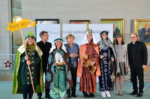 Jeweils vier Sternsinger aus allen 27 deutschen Bistümern vertraten in Berlin die 300.000 engagierten Mädchen und Jungen, die sich rund um das Dreikönigsfest bundesweit an der 60. Aktion Dreikönigssingen beteiligen. Seit 1984 bringen die Sternsinger jedes Jahr ihren Segen „Christus mansionem benedicat – Christus segne dieses Haus“ ins Bundeskanzleramt. Bundeskanzlerin Angela Merkel begrüßte die kleinen und großen Könige bereits zum 13. Mal.