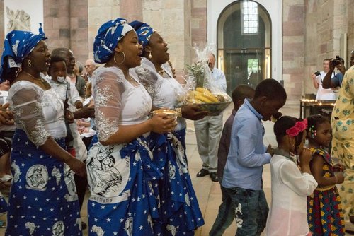 Schon der Eröffnungsvers wurde in mehreren Sprachen vorgetragen, die Lesungen wurden auf Polnisch und Portugiesisch gehalten. Die nigerianische Gemeinde brachte wie gewohnt zu diesem besonderen Termin Gaben mit rhythmischen Klängen und Gesang und in bunten Gewändern zum Altar. Die polnische Gemeinde gestaltete das Pontifikalamt mit Musik und Gesang, unter anderem während der Kommunion mit dem mitreißenden „Abba Vater“. Georgens zelebrierte die Messe gemeinsam mit Domkapitular Franz Vogelgesang und den Priestern der muttersprachlichen Gemeinden. Auch die Fürbitten wurden natürlich in verschiedenen Landessprachen gesprochen.