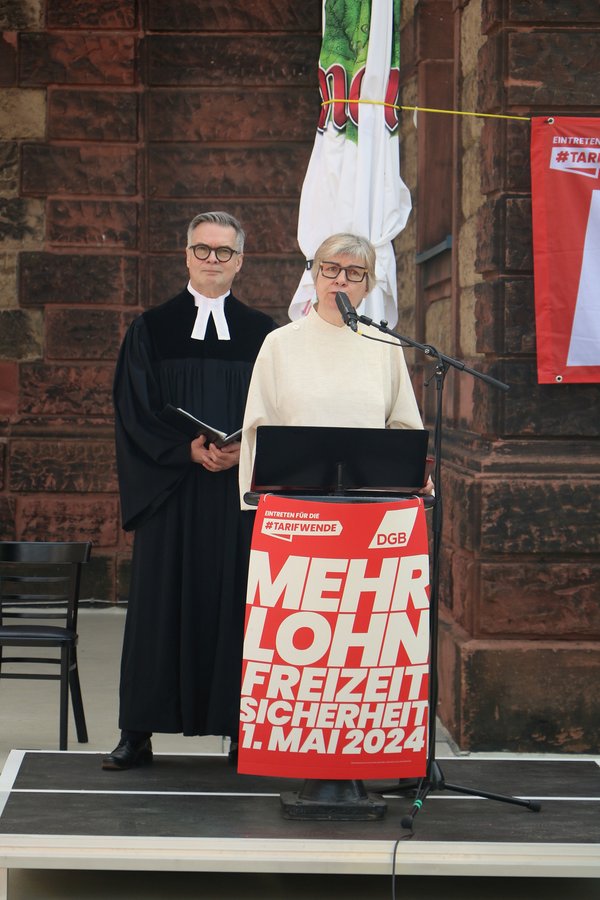 Für den liturgischen Teil zeichnete Regina Wilhelm vom Fachbereich Arbeitswelt verantwortlich. In ihrer Begrüßung ging sie ebenfalls auf die Forderungen des DGB-Motto ein. Sie erinnerte an prekäre Arbeitsverhältnisse, an den Stellenabbau in manchen Branchen sowie an die unzähligen Überstunden, die viele leisten müssten, oder an die zwei und mehr Jobs, die etliche brauchten, um ihren Lebensunterhalt zu bestreiten. Auch in die Fürbitten und Gebeten schloss sie die Anliegen des DGB mit ein. Den musikalischen Rahmen gestalteten – wie auch später - die „Poker Kings“.