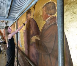 Der komplexe Schadensmechanismus begründet sich nach ihrer Einschätzung in den Wechselwirkungen von klimatischen Bedingungen, in der Vergangenheit liegenden hohen Schwefeldioxidbelastungen. Die Vergipsung entstand im Laufe der Jahrzehnte durch eine chemische Reaktion des originalen Kalkbindemittels mit der Feuchtigkeit und mit den Umweltschadstoffen aus der Luft. „Die entstehende Schwefelsäure dringt in die Substanz ein und reagiert mit Kalk zu Gips. Durch Feuchtigkeit werden Salze mobilisiert und kristallisieren aus. Die Effloreszenzen bewirken außerdem Schleier und Krusten und bilden mit der Zeit eine Feuchtesperrschicht. Diese Schadensprozesse führen zu Beschädigungen und Verlusten an der Putz- und Malschicht“, erklärt die Fachfrau. Diese komplexen Schadensmechanismen würden zusätzlich noch durch die späteren filmbildenden Überzüge verstärkt. Durch das Entfernen späterer Überarbeitungen in Form von Acrylatschichten kann die Vergipsung der originalen Malerei behandelt und ein langfristiger Erhalt ermöglicht werden.