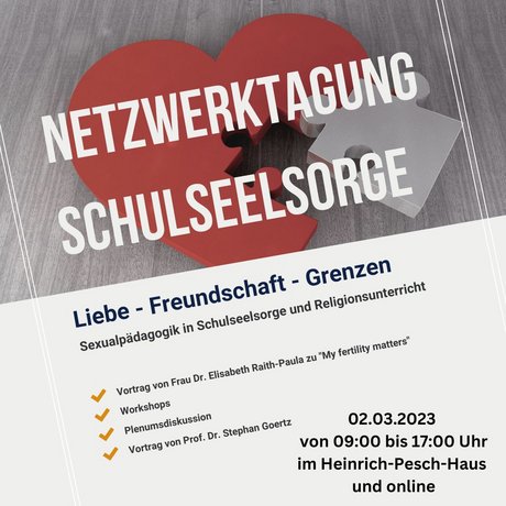 Ludwigshafen. Wir laden Sie herzlich ein zu unserer Fach- und Netzwerktagung Schulseelsorge im Schuljahr 2022/2023 unter dem Thema „Liebe – Freundschaft – Grenzen, Sexualpädagogik in Schulseelsorge und Religionsunterricht“.