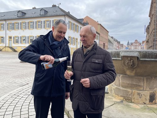 Dr. Gottfried Jung, Vorsitzender des Dombauvereins Speyer, und Steven Kärgel, Geschäftsführer der Winzergenossenschaft Deidesheim, verkosten den neuen Domsekt © Domkapitel Speyer