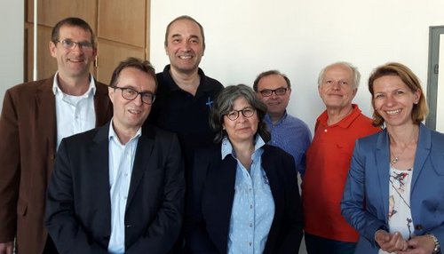 Teilnehmerinnen und Teilnehmer in Karlsruhe 2018: Monika Buscher, SWR (Mitte), (v.l.n.r.): Thomas Belke, Erzdiözese Freiburg, Michael Weyand, Bistum Trier, Michael Beisel, Evangelische Landeskirche Baden, Hartmut Göppel. Bistum Mainz, Ekkhard Lagoda, Evangelische Kirche im Rheinland, Irina Kreusch, Bistum Speyer. (Es fehlt auf dem Foto die jüdische Vertreterin, Susanne Benizri)