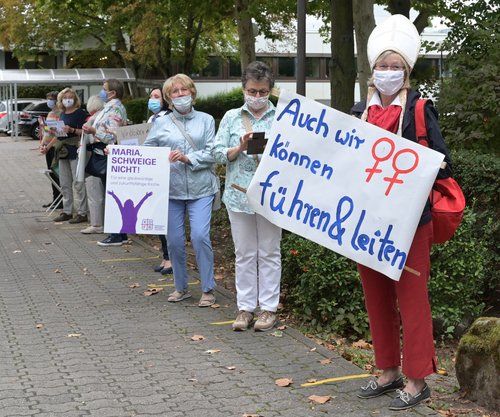 Von Beginn hatten rund 30 Protestierende für Frauenrechte demonstriert. Auf Schildern stand etwa "Das 11. Gebot: Fürchte dich nicht vor dem Weiblichen" und "Wo Unrecht zu (Kirchen)Recht wird, wird Widerstand zur Pflicht". Zum Abschluss der Tagung veranstaltete die Initiative Maria 2.0 eine Mahnwache vor dem Heinrich-Pesch-Haus.