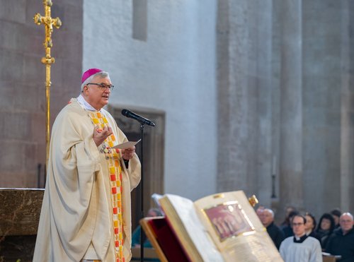Der Glauben schenke den Christinnen und Christen die Kraft einer tieferen Liebe und eines tieferen Vertrauens. Diese Kraft helfe, so Wiesemann, sich aufzumachen, um anderen zu helfen: „Menschlichkeit und Humanität erweisen, ein Licht in diese Welt tragen, nicht verzweifeln, nicht einfach aufgeben, nicht in die Gleichgültigkeit der Welt hineingehen, nicht in den Hass, nicht in das Dunkle, sondern immer wieder neu, wo wir auch sind, anfangen, dieses Osterlicht anzuzünden. Das ist unsere Berufung und Sendung als Gläubige, als Kirche. Nehmen wir dieses Licht für uns an und tragen es aus diesem wunderbaren Dom, der uns ein Zeichen dafür ist, wie siegreich die Kraft dieses Glaubens ist, durch alle Jahrhunderte hindurch. Nehmen wir heute unsere Verantwortung als Christen in dieser Welt wahr.“