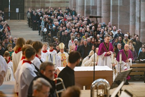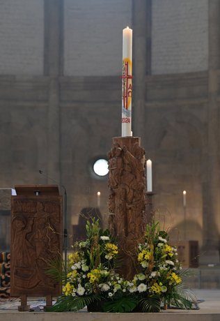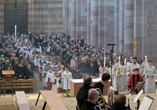 „Was hat diese Kathedrale in diesem Jahrtausend nicht alles erlebt?“ Der Speyerer Dom zeige, so Wiesemann, das gewaltige Auf und Ab der Menschheitsgeschichte. Und dennoch sei die Kathedrale immer wieder aufgebaut worden – durch den Fleiß der Menschen und auch durch den Glauben, den das Osterlicht in die Welt gebracht hat. „Das ergreift mich in diesem Jahr in besonderer Weise, da wir so ein Licht der Hoffnung, des Trostes und der Zuversicht in unserer Welt brauchen, die so vielfältig heimgesucht wird von Krisen, Kriegen und Katastrophen. Ein Licht, das die Kraft hat, uns Zukunft zu erschließen, Mut zu machen und Leben gegen die Macht des Todes zu setzen“, predigte Bischof Wiesemann in der Osternacht.