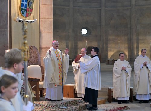 Speyer. Mit den Ostergottesdiensten feierten die Gläubigen im Bistum Speyer die Auferstehung Jesu Christi und damit das höchste Fest im Kirchenjahr. Die Osternacht wurde feierlich mit dem Ruf „Lumen Christi – Deo gratias“ (Christus, das Licht – Dank sei Gott) eröffnet: In der Vorhalle des Doms, der zu Beginn der Feier in völliger Dunkelheit lag, wurde das Osterfeuer entzündet, bevor mit der Osterkerze das Licht in die Kathedrale hineingetragen wurde. „Ergreifend ist es in jedem Jahr, wenn wir mit der Osterkerze hier in diesen heiligen Raum hinein ziehen. Diese Kerze, dieses Licht, wird in einen Raum getragen, der für 1000 Jahre Menschheitsgeschichte steht“, so Bischof Wiesemann in seiner Predigt in der Osternacht.