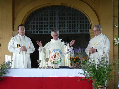 Eucharistiefeier an der Heiligenkirche in den Weinbergen über Bockenheim: (v.li.n.re.) Pfarrer Martin Tiator, Grünstadt, Diözesanpräses Pfarrer Michael Baldauf, Diözesanvorsitzender Diakon Andreas W. Stellmann.