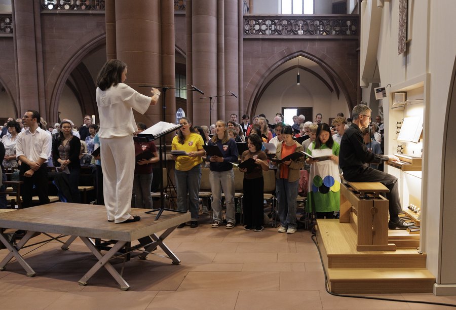 Als erstes Lied ließ Organist Stefan Schlipf – der nach der Eröffnung auf der historischen Klais-Orgel von der Empore in den Innenbereich gewechselt war – dann das kleine Flötenkonzert in F von Justin Heinrich Knecht ertönen und zeigte damit direkt die Bandbreite der neuen Chororgel. Diese wird Roeder-Orgel genannt. Erwin Roeder war lange im Vorstand des Orgelvereins, der seit Langem den Traum einer Chororgel in der Marienkirche verfolgte. Roeder übernahm schließlich die Finanzierung von 700.000 Euro und machte diesen Traum wahr. „Er hat mir damals gesagt, schonen Sie mich nicht, holen Sie das Beste heraus“, berichtete Pfarrer Martin Olf. Roeder selbst konnte den Gottesdienst aus gesundheitlichen Gründen nicht besuchen, hatte „seine“ Orgel aber im Vorfeld schon einmal spielen hören dürfen.