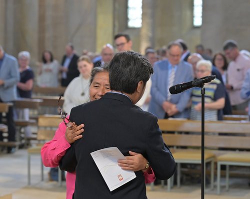 „Liebe jubilierende Ehepaare! Dieses Ja hat viele Jahre, Jahrzehnte ihres Lebens ausgefüllt. Wenn Sie diese Zeit an sich vorbeiziehen lassen – beim Blättern in den Fotoalben, bei Gesprächen, durch Filme – was ist alles darin enthalten, seitdem Sie damals zueinander Ja gesagt haben!“ Dieses Ja stehe auch für eine Zeit des Durchhaltens, des zu-dem-anderen-Stehens – auch in herausfordernden Zeiten, in Zeiten des Leids. „Dann Ja zu sagen, wenn der Himmel nicht mehr voller Geigen hängt, sondern nur noch dunkle Wolken zu sehen sind“, betonte Georgens. „Auch angesichts von Versagen, Untreue und Schuld - dennoch Ja sagen: Ja, ich stehe zu dir. Das Ja des Anfangs, ich halte es durch, ich stehe dazu.“