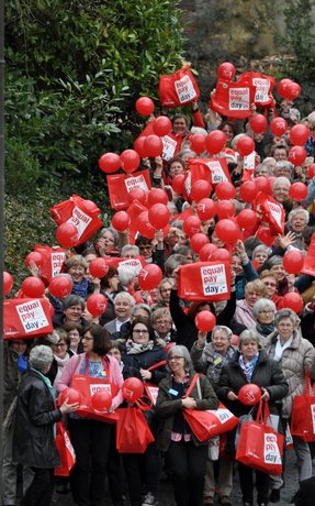 Mit ihrer Aktion am Frauenbegegnungstag machten Frauenseelorge, KDFB und kfd auf die erheblichen Verdienstunterschiede von Männern und Frauen aufmerksam. Die Teilnehmerinnen wurden mit einem heiteren Lied, vorgetragen von der neuen KDFB-Diözesanleiterin Monika Keggenhoff und KDFB-Frau Regina Mendel, auf dieses ernste Thema eingestimmt: "Das ist ja zum in die Luft gehen", was dann auch die roten Luftballons symbolisierten.