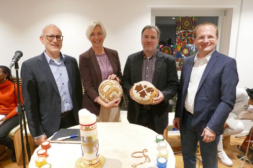 Freude über neue Räume der Campus-Gemeinde (v. l.n.r): Dr. Klaus Müller (Oberkirchenrat/ Evangelische Kirche der Pfalz), Britta Geburek-Haag (Studierendenpfarrerin), Stefan Seckinger (Hochschulpfarrer), Ingo Faus (Abteilungsleiter Hochschulpastoral im Bistum Speyer).