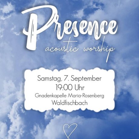 Waldfischbach-Burgalben. Am Samstag, dem 7. September 2019, findet um 19 Uhr in der Gnadenkapelle des Wallfahrtsortes Maria Rosenberg unter dem Titel „Presence“ („Gegenwart“) ein Lobpreisabend statt. Mitgestaltet wird der gut einstündige Gottesdienst anderer Art durch eine Band, bestehend aus jungen Leuten der christlichen Gemeinschaft CHARA aus Gerbach und Waldfischbach-Burgalben.