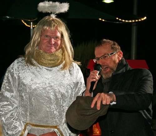 Die himmlische Erscheinung ist kein Geringerer als Jürgen Doll, Ortsvorsteher des Landauer Stadtteils, der nach sanfter Landung der Lkw-Arbeitsbühne entsteigt, um den Einsatz seiner Wette mit dem Caritas-Förderzentrum St. Laurentius und Paulus einzulösen: 40 Freischoppen Glühwein an die Marktbesucher ausgeben. Die ist Doll schuldig, weil es dem Förderzentrum im Laufe des Jahres gelungen ist, mindestens 40 Ehrenamtliche für Aktionen mit Bewohnern zu mobilisieren. Beim letzten Queichheimer Neujahrsempfang hatte Doll dagegen gewettet, und wenn er gewonnen hätte, hätte er sich auf ein monatliches Frei-Frühstück, serviert im Ortsvorsteherbüro, freuen können. Aber Doll hat verloren, das konnte Alexander Hahn, Leiter des Projekts „LiLi - Leben in Landau inklusiv“, vor dem Einschweben des Engels auf dem „Wichtelmarkt“ verkünden. Unter der Ägide von „LiLi“ hatte die Wette gestanden. Hahn rief die Namen der ehrenamtlichen Mitarbeiterinnen und Mitarbeiter aus, die das Projekt im Laufe des Jahres unterstützt haben. Beim 42. Namen war klar, dass das Förderzentrum die Wette gewonnen hatte. Mit viel Applaus empfingen die Marktbesucher ihren engelsgleichen Ortsvorsteher, der bekannte, dass sich der „Flug“ aus 25 Metern Höhe doch ziemlich wackelig angefühlt habe. „Ich dachte, ich fliege wirklich“, sagte er, bevor er sich noch einmal das vom Chawwerusch-Theater zur Verfügung gestellte Blondhaar aus dem Gesicht strich und sich an den Glühweinausschank machte.
