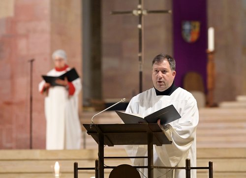 Freut sich über mehr Musik am Dom: Domkapellmeister Markus Melchiori beim Kantorendienst im Pontifikalamt am Aschermittwoch 2021.