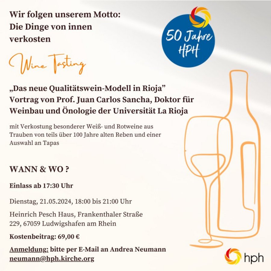 Ludwigshafen. Das Heinrich Pesch Haus (Frankenthaler Str. 229, Ludwigshafen) lädt am Dienstag, 21. Mai 2024, um 18 Uhr zu einem besonderen Ereignis zum 50-jährigen Jubiläum ein: Prof. Juan Carlos Sancha, Doktor für Weinbau und Önologie der Universität La Rioja spricht über „Das neue Qualitätswein-Modell in Rioja“. Daran schließt sich eine Verkostung besonderer Weiß- und Rotweine mit einer Auswahl an Tapas an – getreu dem ignatianischen Motto „Die Dinge von innen verkosten“.