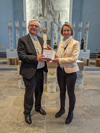 Bischof Dr. Karl-Heinz Wiesemann nahm die Königin der Menschenwürde von Dr. Irina Kreusch entgegen. © Bistum Speyer