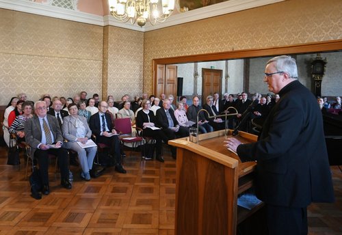 Ausdrücklich verwies Professor Bischof auf die Tatsache, dass die Einbrüche im kirchlichen Leben nicht mit dem Konzil begonnen hätten, sondern bereits in den 1950er Jahren, ausgelöst von den gesellschaftlichen Veränderungen. Professor Bischof skizzierte in einer „Zeitreise“ Stationen, die den Lebensweg Ernst Guttings als Seelsorger begleiteten – vom „Reformstau“ vor dem Zweiten Vatikanischen Konzil, über das Bemühen des Konzils, die Zeichen der Zeit zu erkennen, bis zu den späteren Auf- und Umbruchzeiten - und Verwerfungen. Für Weihbischof Gutting war das Konzil immer zentraler Bezugspunkt. Das wurde auch nochmals in einer abschließenden Gesprächsrunde mit den Referenten des Tages deutlich. Mit Blick auf die gegenwärtige Krise der Kirche würde Weihbischof Ernst Gutting uns raten, die Texte und Ergebnisse des Konzils nochmals intensiv zu studieren und in unsere Zeit hinein zu übersetzen, so Klaus Haarlammert. Der frühere Chefredakteur des „pilger“ und langjährige Wegbegleiter Guttings trug den Vortrag von Professor Zulehner vor, der krankheitsbedingt nicht an der Festakademie teilnehmen konnte.