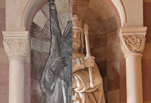 Parallel dazu gehen die Reinigungsarbeiten an den Skulpturen und Reliefs in der Vorhalle weiter, nun allerdings mittels moderner Lasertechnik. Im April 2016 fand bereits eine Probereinigung der Skulptur Heinrich IV. mit Hilfe dieser Methode statt, die aus Sicht der Restauratoren sehr zufriedenstellend verlief. Dom- und Diözesankonservator Wolfgang Franz erläutert das Verfahren: „Bei der Technik des Laserabtragens dünner Deckschichten handelt es sich um eine Oberflächenbearbeitung mit gepulster Laserstrahlung und vernachlässigbarer Wärmebelastung des Grundwerkstoffes. Die dunkle Schmutzschicht wird verbrannt, zurück bleibt der helle Sandstein.“ Das Steinmaterial wird dabei, im Gegensatz zu traditionellen Techniken wie mechanischer oder chemischer Reinigung, nicht unmittelbar berührt oder gar geschädigt. Zudem ist die Reinigung mit dieser Methode relativ schnell zu bewerkstelligen, so dass eine Figur innerhalb von etwas mehr als zwei Wochen gereinigt werden kann.