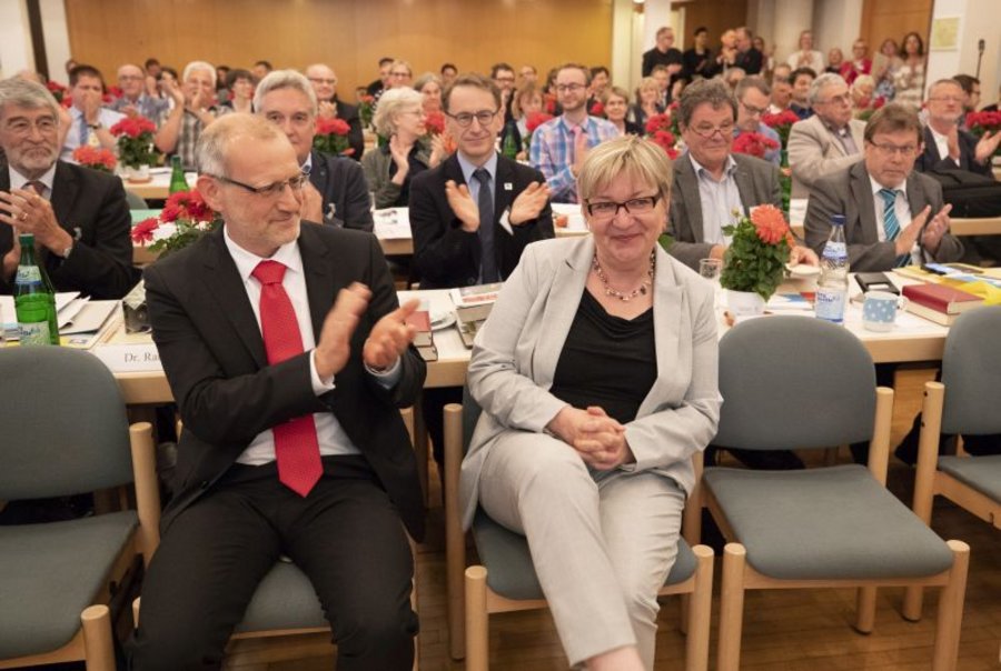 Domkapitular und stellvertretender Generalvikar Josef Szuba gratuliert Dekanin Dorothee Wüst zu ihrer Wahl - Grußwort des Ökumenebeauftragten des Bistums Speyer Thomas Stubenrauch bei der Tagung der Landessynode der Evangelischen Kirche der Pfalz in Kaiserslautern