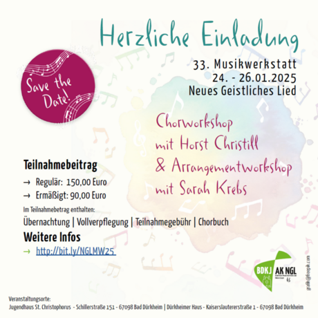 Alljährlich organisiert der Arbeitskreis Neues Geistliches Lied des Bundes der Deutschen Katholischen Jugend (BDKJ) Speyer die Musikwerkstatt. Sie bietet den musikalisch Interessierten die Möglichkeit, neue Lieder für Gottesdienst und Gemeindeleben kennenzulernen und diese auszuprobieren. Christian Knoll, dem Leiter des Arbeitskreises und Referent für Religiöse Bildung, ist es wichtig, dass „die Teilnehmenden sich musikalisch austoben können. So können sich die Instrumentalist:innen in verschiedene Arrangements einbringen und ausprobieren. Gemeinsam werden Liedverläufe und Solomelodien erarbeitet.“