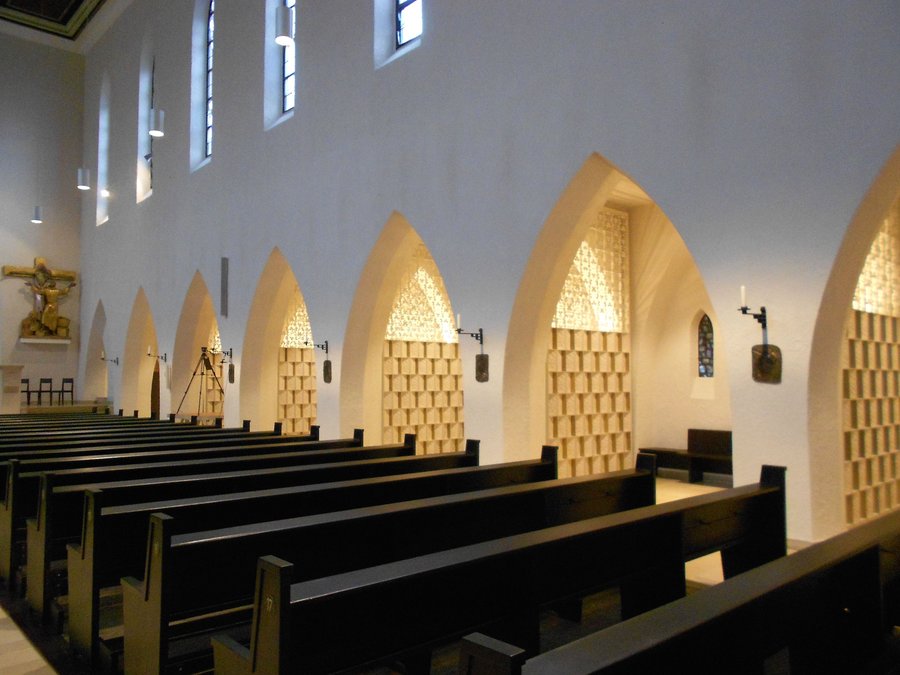 Das Hauptaugenmerk galt an diesem Abend jedoch dem neu errichteten Kolumbarium. Dort, wo vorher die Beichtstühle waren, präsentiert es sich nach einem Umbau in den Seitenschiffen in jeweils fünf Nischen. Jede von ihnen scheint eine kleine Kapelle für sich zu sein. Diesen Eindruck unterstützen die spitzbogigen Zugänge und Fenster. Zu beiden Seiten der Nischen sind die Urnenwände eingebaut. Im Unterschied zu vielen anderen kommen sie nicht in Grau daher, sondern greifen das helle Raumkonzept auf.
