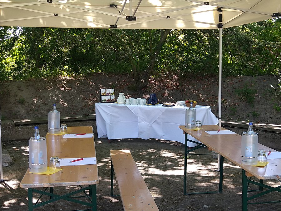 „Möchten Sie Ihre Kollegen, Kunden, Vereinsfreunde oder Familienmitglieder endlich wieder einmal sehen? Unser wunderschöner Park mit seinem herrlichen Baumbestand bietet viele Plätze für ungestörte Begegnungen“, erklärt Pater Tobias Zimmermann SJ, der Direktor des Heinrich Pesch Hauses. Schattige Plätze, viel Grün und frische Luft bieten den passenden Rahmen für ein "Green Meeting" im Park. Für kühlere oder regnerische Tage hat das Heinrich Pesch Haus ein großes Zelt aufgebaut. Auch im Außenbereich steht den Gästen und Besuchern das Seminarequipment des Hauses zur Verfügung.