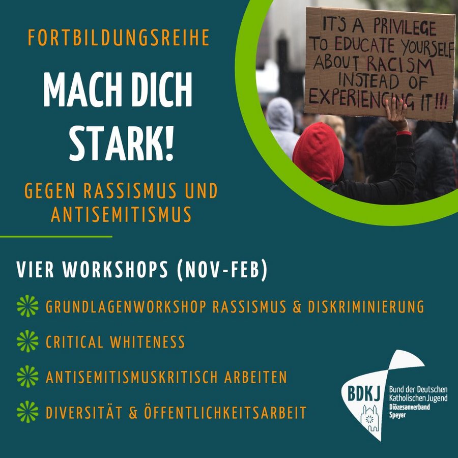 Speyer. Am 15. November startet die vierteilige Fortbildungsreihe „Mach dich stark! Gegen Rassismus & Antisemitismus“ des BDKJ Speyer. In den vier Workshops können sich die Teilnehmenden mit den Themen Rassismus (15.11.), Critical Whiteness (13.12.), Antisemitismus (18.01.) sowie Diversität & Öffentlichkeitsarbeit (11.02.) (selbst)kritisch auseinandersetzen.