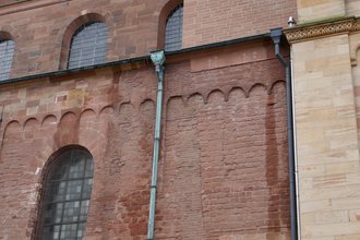 Dass die Arbeit an den Türmen dringend notwendig ist, zeigte die Dombaumeisterin eindrucksvoll mit einem kleinen Filmclip, bei dem der Steinmetz den Putz mit der bloßen Hand großflächig von der Wand abnehmen konnte, es also keine Bindung mehr zum Mauerwerk gab. Nach der Putzabnahme begannen weitere Analysen. So läuft derzeit noch eine Untersuchung der Putze und Mörtel in Zusammenarbeit mit dem Institut für Steinkonservierung in Mainz. 77 stark geschädigte Steine müssen ausgetauscht werden, wofür nach einer Bemusterung Haardter Sandstein (gelb) und Elsässer Sandstein (rot) ausgewählt wurden. Aktuell arbeiten Steinmetze und Putzer an den Außenflächen des Turms. Letztere legen Musterflächen für die Neuverputzung der Turmhelme an.