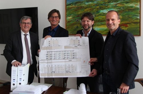 Bei der Beantragung des Bauvorhabens (v.l.): OB Hansjörg Eger, Gerhard Müller, Thomas Andres (GSW), Bernd Reif, Stadtentwickler.