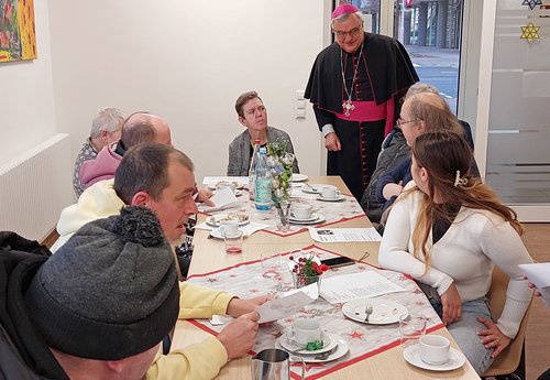 Erste Station war die liebevoll weihnachtlich dekorierte Cafeteria des im Jahr 2018 fertiggestellten Neubaus von St. Johannes, wo der Bischof bereits von zahlreichen Kundinnen und Kunden der Einrichtung, die sich zur Feier mit ihm und dem Mitarbeitenden-Team eingefunden hatten, freudig begrüßt wurde. Und auch Bischof Dr. Karl-Heinz Wiesemann bekundete gleich zu Beginn der Veranstaltung, dass es ihm eine besondere Freude sei, hier sein zu können - sei es doch zugleich sein erster Besuch in dem neuen Gebäude.