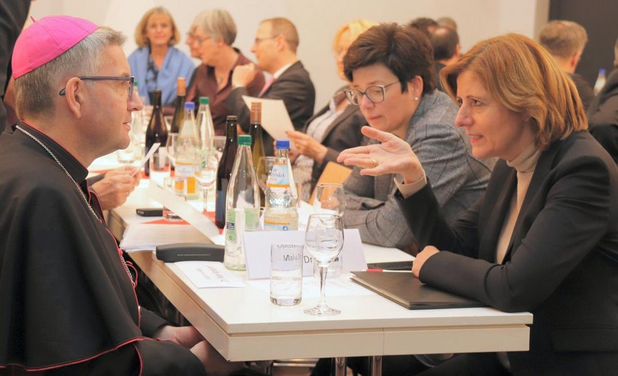 In der Verteidigung einer offenen und pluralen Demokratie seien die Kirchen wichtige Partner. Die Ministerpräsidentin appellierte an alle Katholiken und Katholikinnen, sich für das Gelingen des Synodalen Weges einzusetzen, der am ersten Advent beginnt. Die Kirche müsse ihre Krise überwinden, damit sie weiter eine starke Stimme für Menschlichkeit in der Gesellschaft sein könne. Nach dem Grußwort Dreyers sprach der Limburger Bischof Dr. Georg Bätzing ein abschließendes Wort des Dankes.