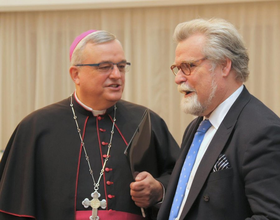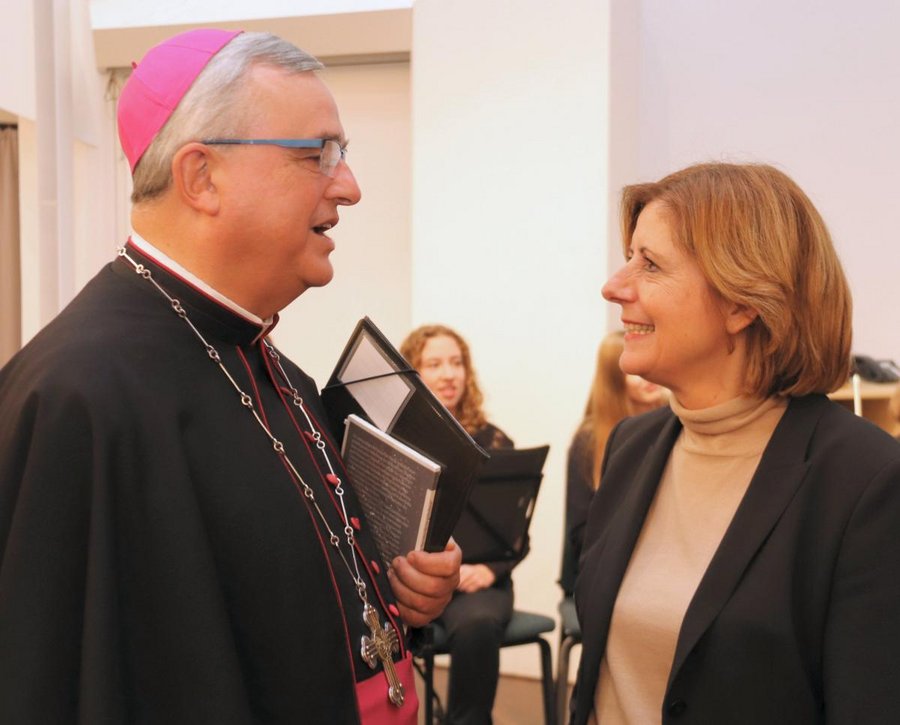 Die Begrüßung im Ketteler-Saal des Erbacher Hofes hatte der Leiter des Katholischen Büros Mainz, Ordinariatsdirektor Dieter Skala, übernommen. Er begrüßte rund 160 Gäste aus Politik, Kirche und Verwaltung. Neben Ministerpräsidentin Dreyer waren unter anderen die Staatsministerinnen Sabine Bätzing-Lichtenthäler und Doris Ahnen gekommen sowie die Staatsminister Roger Lewentz, Professor Dr. Konrad Wolf und Herbert Mertin. Auch der Präsident des Verfassungsgerichtshofes Rheinland-Pfalz, Dr. Lars Brocker, sowie Vertreter aller im rheinland-pfälzischen Landtag vertretenen Parteien waren der Einladung des Katholischen Büros gefolgt. Aus den rheinland-pfälzischen Bistümern waren neben Bischof Wiesemann und Bischof Bätzung unter anderen der Mainzer Bischof Peter Kohlgraf und der Bischof von Trier, Dr. Stephan Ackermann, gekommen. Musikalisch gestaltet wurde der Abend von Schülerinnen des Jugendorchesters der Bischöflichen Maria-Ward-Schule Landau unter der Leitung von Agnes Hoffmann.
