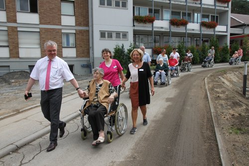 Christian Hassa, dem Leiter von St. Bonifatius war die Freude anzusehen, als er die Bewohner bei ihrem Umzug vom alten in das neue Gebäude begleitete. Jeden einzelnen Bewohner hieß er persönlich in den neuen Räumen willkommen, ebenso die knapp 20 Mitarbeiter des alten Gebäudes, die nun auch im neuen Haus beschäftigt sind. „Es ist ein bewegender Moment für mich. Ich weiß, dass es auch für Sie sehr bewegend ist“, sagte er beim Sektempfang in der neuen Wohnküche. Er wünsche sich, dass die Begegnungen der Menschen jeden Tag aufs Neue eine Kraftquelle seien. Er dankte Annette Schenk, der bisherigen Leiterin von St. Matthias, und Pflegedienstleiterin Michaela Merbt für ihren unermüdlichen Einsatz bei der Vorbereitung des Umzugs. „Du hast nun den Goldschatz: die Bewohner, Mitarbeiter und Angehörigen von St. Matthias. Bewache ihn gut!“, sagte Annette Schenk, die ab Oktober Timo Kittler als neue Leiterin des Caritas Altenzentrum St. Elisabeth in Germersheim ablöst.