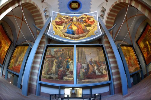 „Nicht Biskuit für das Volk, sondern tägliches Brot“ – so begründete König Ludwig I von Bayern 1843 sein Vorhaben, den Dom zu Speyer „innen ausmalen zu lassen“. Im Stil der „Nazarener“ sollte dies ausgeführt werden, jener Gruppe von Malern, die sich Anfang des 19. Jahrhunderts zum Ziel gesetzt hatten, die religiöse Kunst zu erneuern. Einem von ihnen, Johann Baptist Schraudolph (1808 bis 1879), vertraute der König dieses große Werk im Dom an, das er mit zwölf Gehilfen 1848 bis 1853 ausführte: eine monumentale Komposition aus 123 Fresken mit 470 überlebensgroßen Figuren, eingefasst von reicher Dekorationsmalerei. Der damalige Bischof von Speyer, Nikolaus von Weis, erstellte zusammen mit Wilhelm Molitor und Konrad Reither das theologische Bildprogramm, ganz als Hinführung zum Glauben – als Katechese und Verkündigung. Schon bald nach der Fertigstellung setzte die Kritik am Stil dieser Malerei ein, die Mitte des 20. Jahrhunderts dazu führte, dass sie entfernt wurde. Ein weiterer Grund waren die massiven Eingriffe in die Romanik des Domes, bis in die Bausubstanz hinein. Heute sind im Dom an ihrem ursprünglichen Ort lediglich die 24 Bilder des „Marienzyklus“ erhalten, und im Kaisersaal sieben gerettete Fresken aus dem Querhaus des Domes samt der „Marienkrönung“ aus der Apsis.